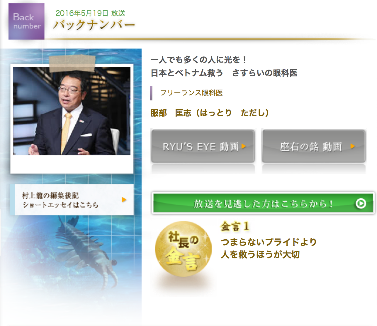 ● テレビ東京の看板番組の「カンブリア宮殿」に服部医師が出演しました