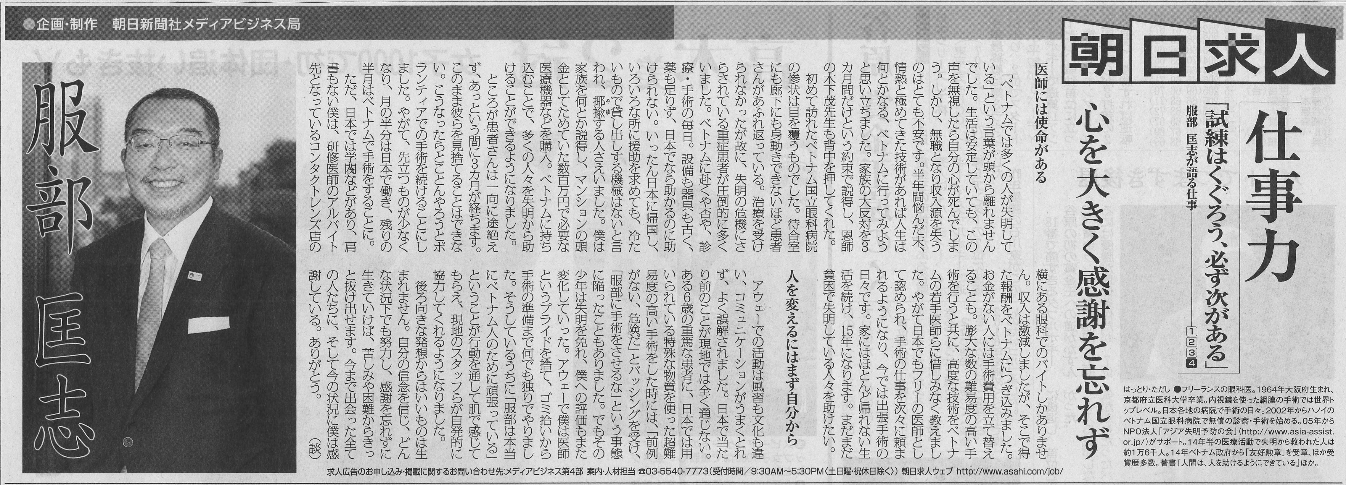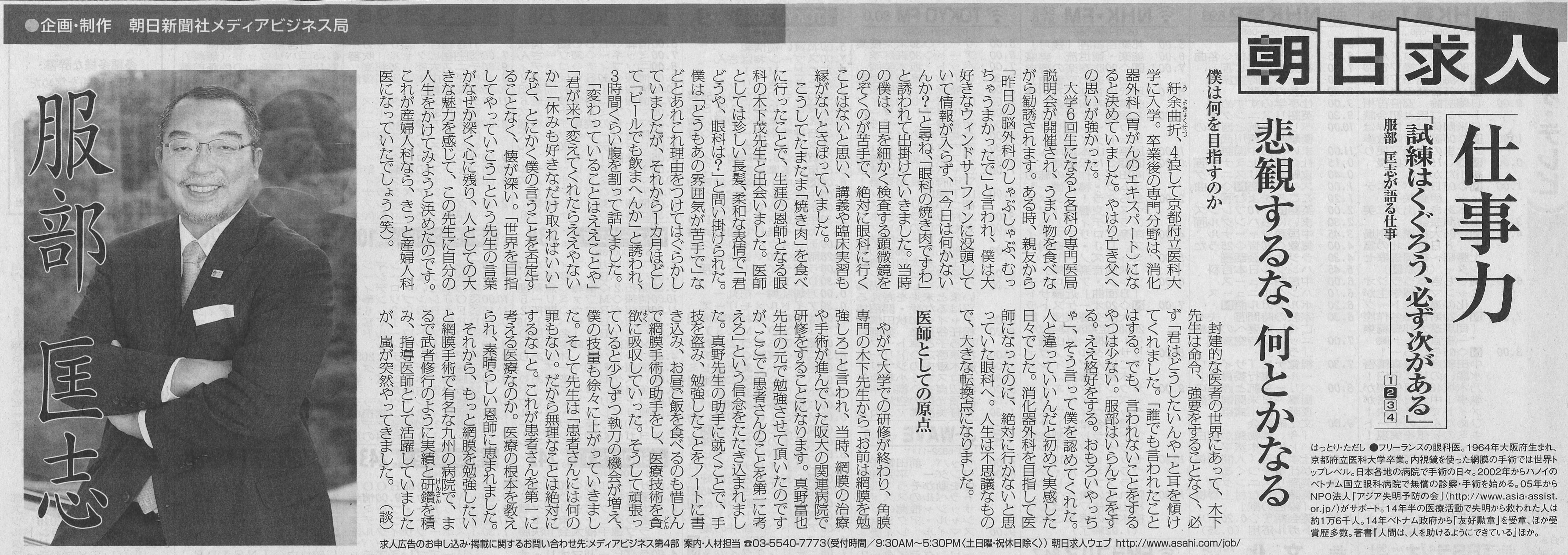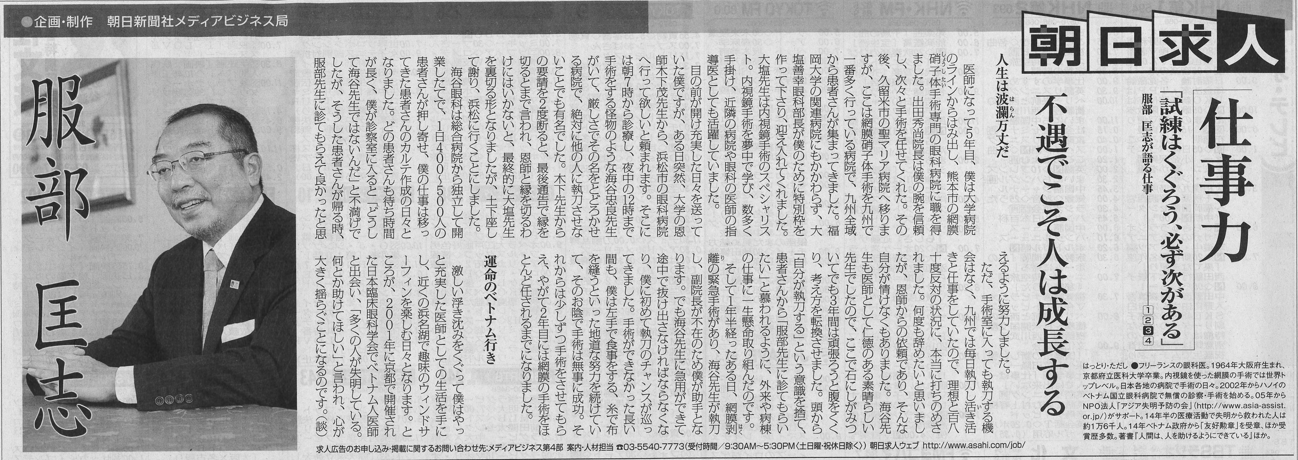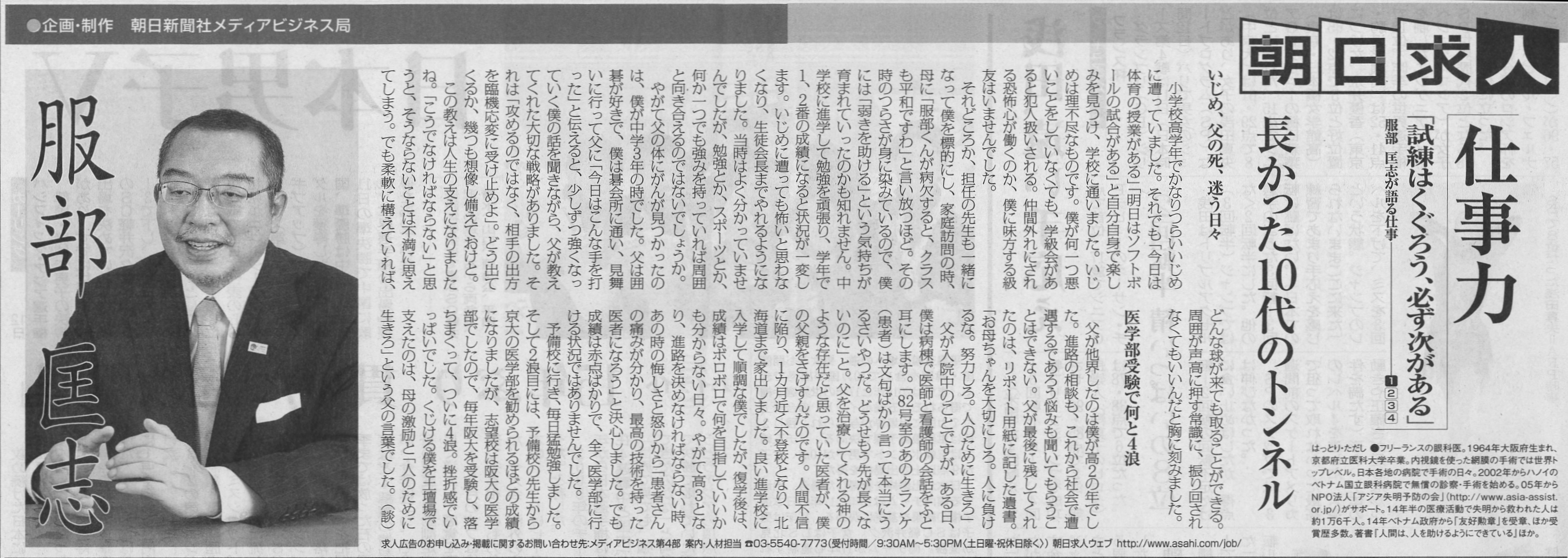 >朝日新聞「仕事力」で服部医師の4週連続インタビューが掲載されました